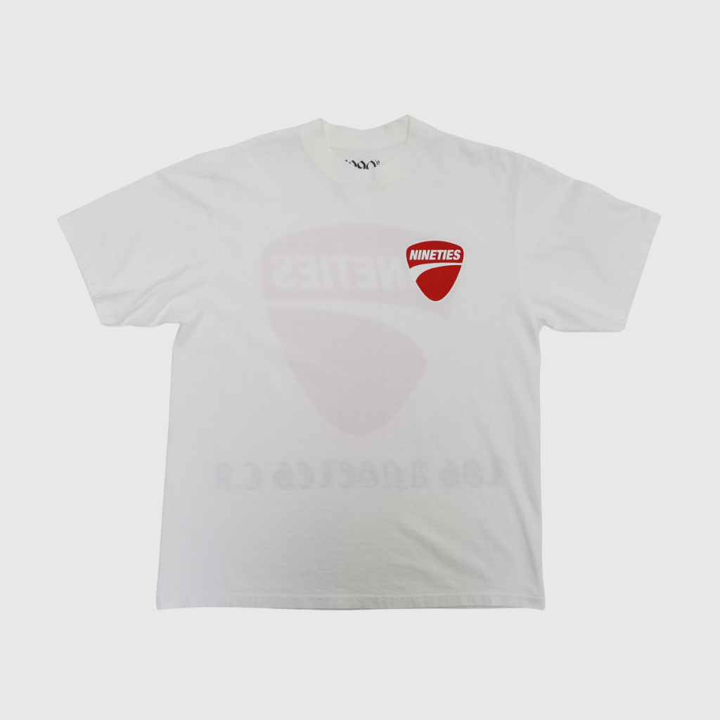 Description: A fresh white t-shirt featuring a bold red "Nineties" graphic on the front, along...