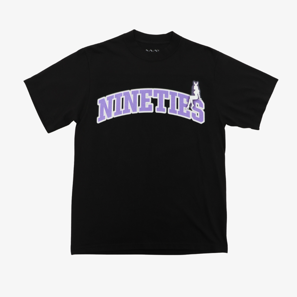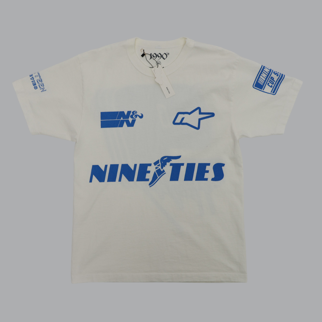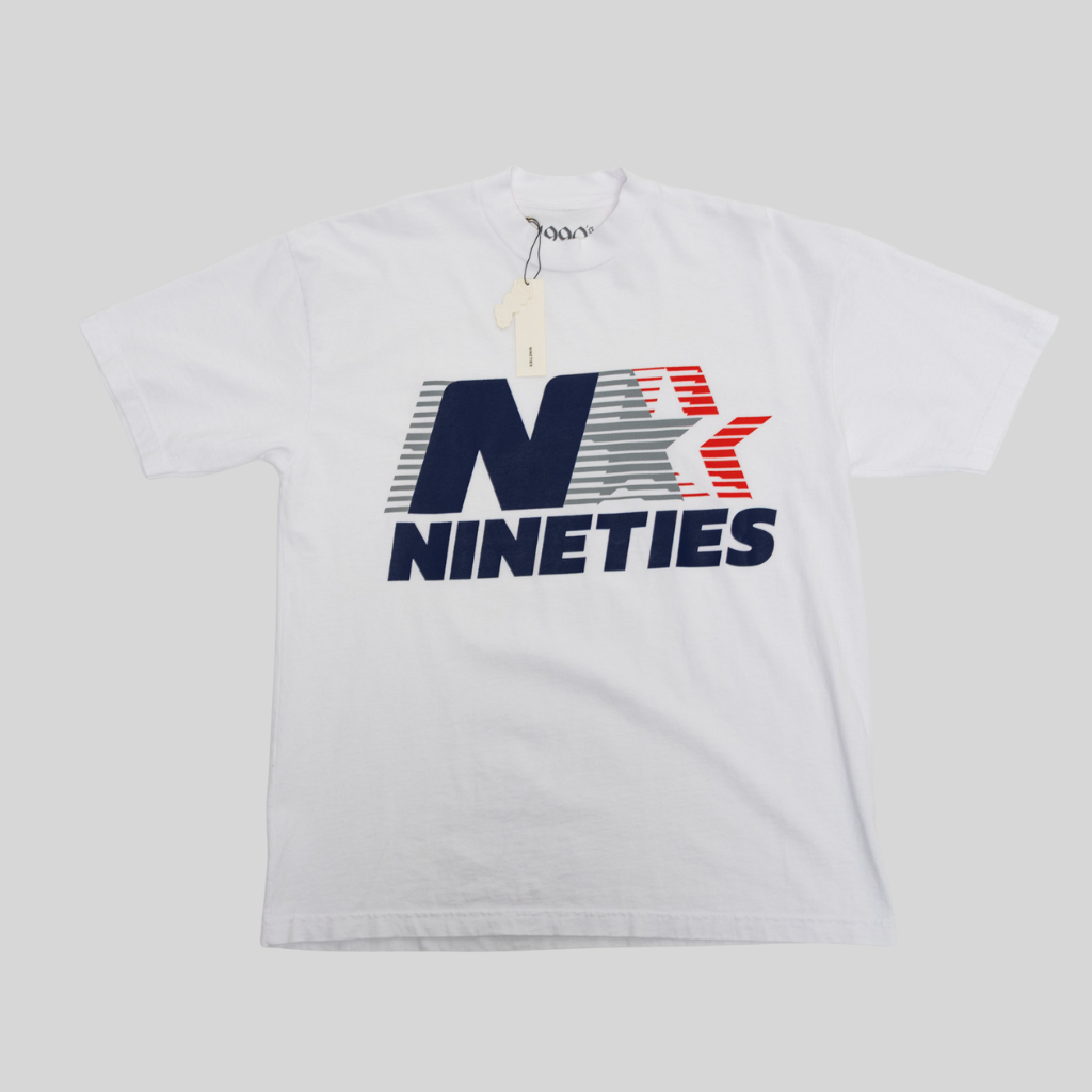 Description: A clean, bold white t-shirt featuring a retro-style "Nineties" graphic with striped lettering and...