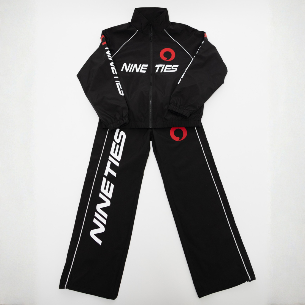 Description: This full track suit includes a sleek black jacket and matching pants, both featuring...